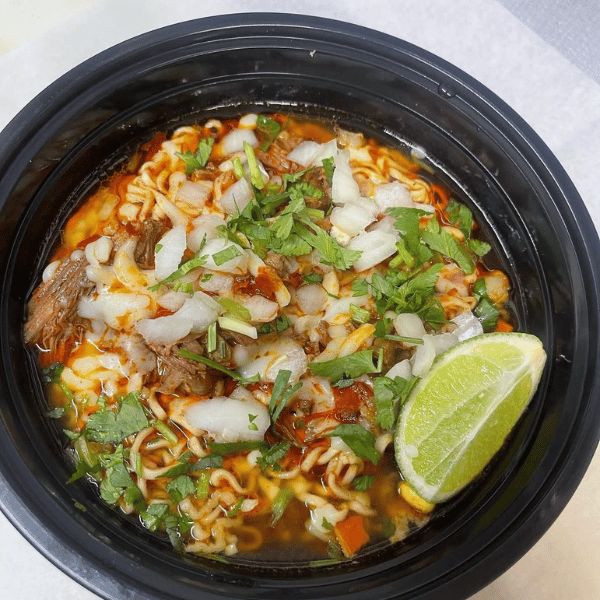 Noodles, birria meat, onions, cilantro and cheese