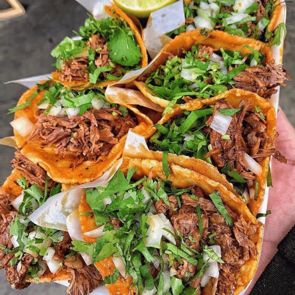 Birria meat, flour tortilla, onion,
